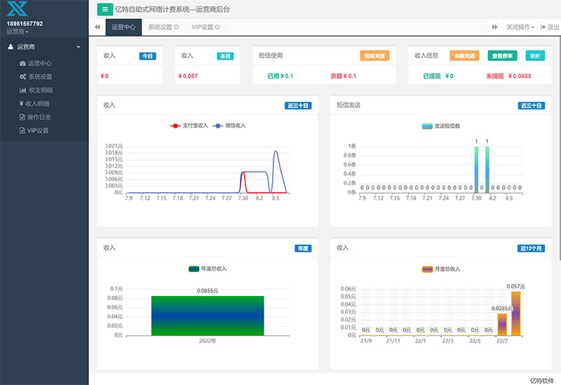 用户充值后即可上网。用户充值收入会计入运营者账户中。我公司按4.5%收取运营费后。