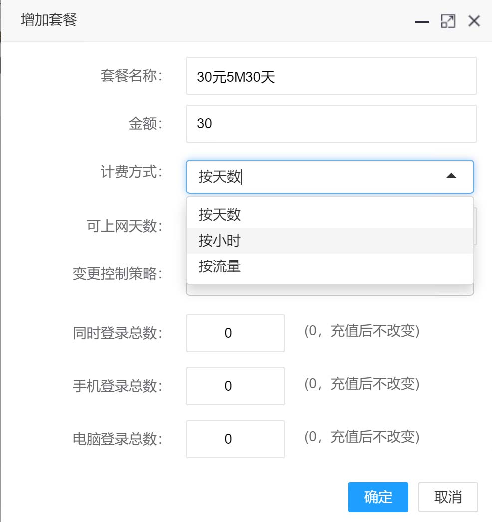 - 本系统支持三种计费方式:按天数、按小时、按流量。根据自己的需要选择相应的计费方式。