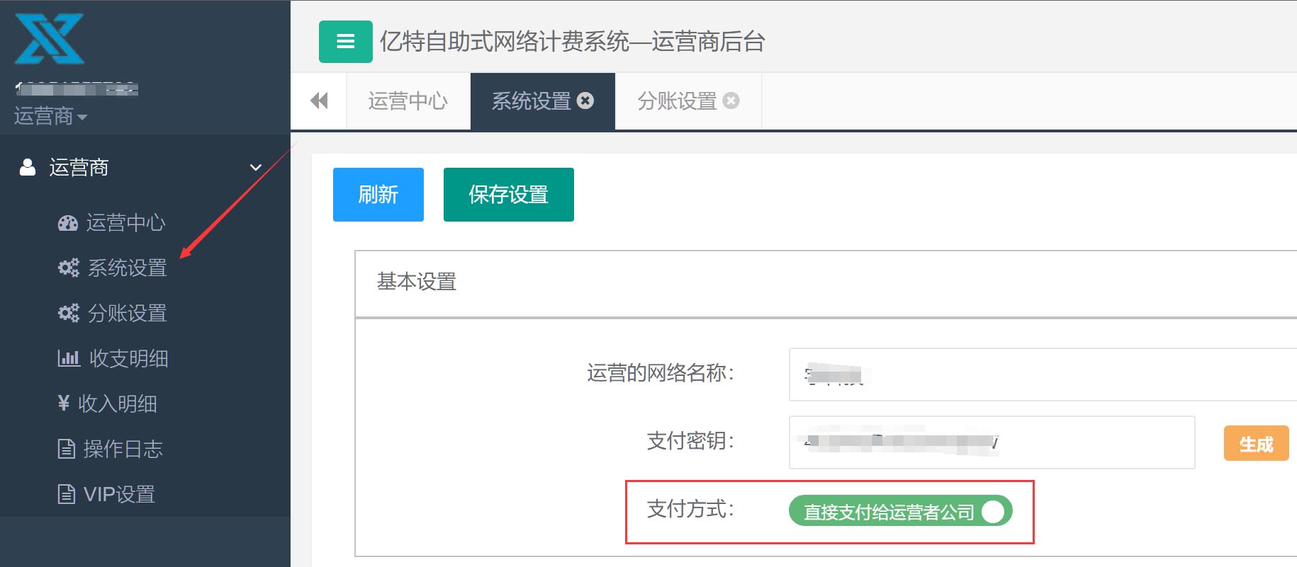 按上图所示,在“系统设置”页面中的“支付方式”选择“直接支付给运营者公司”。