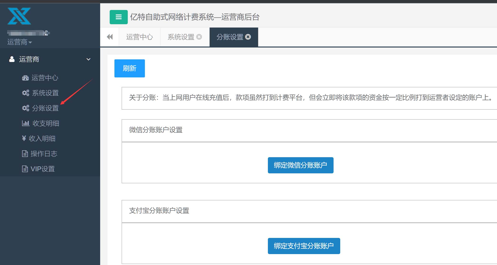 - 不使用“直接打款到公司账户”时必须要设置分账。设置分账后,用户支付上网费后可以属于运营者的费用直接转到运营者绑定的分账账户。